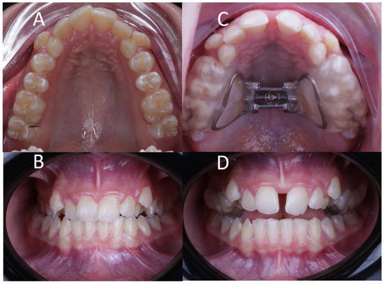 (A) Preoperative occlusal and (B) frontal view, and (C) postoperative occlusal and (D) frontal view after RME treatment with McNamara appliance.