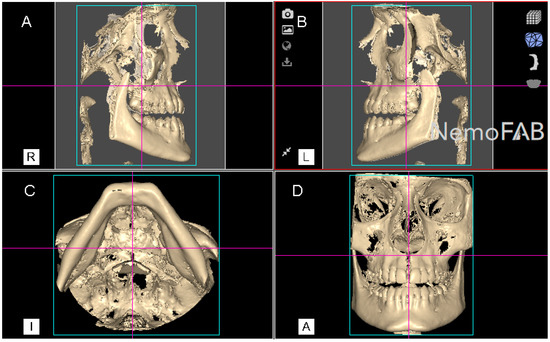 (A) Right lateral, (B) left lateral, (C) bottom and (D) frontal view of the postoperative cone-beam computed tomography (CBCT) scans, aligned to the Frankfort plane and the midsagittal plane was perpendicular to the ground.