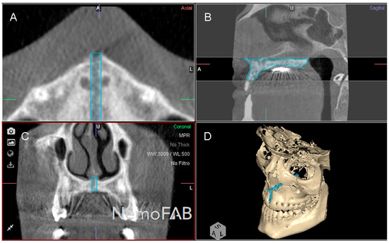 Then, the geometric prism of the expanded palatine suture was selected and isolated by analyzing the boundaries of the palatine suture expansion in transversal (Figure 3A), sagittal (Figure 3B), coronal (Figure 3C) plane and the three-dimensional reconstruction of the CBCT scan (WhiteFox, Satelec, Merignac, France) (Figure 3D). Subsequently, the anatomical references that delimited the boundaries of the geometric prism after the palatine suture expansion were identified by the two anterior nasal spines and the two posterior nasal spines.