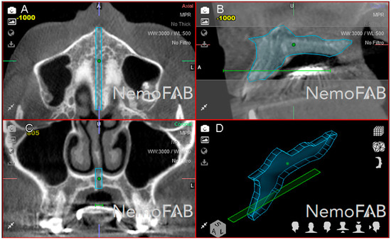 After the palatine suture expansion was achieved by rapid maxillary expansion appliances through disjunctor, all the patients were submitted to a postoperative CBCT scan (WhiteFox, Satelec, Merignac, France) with the following exposure parameters: 105.0 kV peak, 8.0 mA, 7.20 s, and a field of view of 15 mm × 13 mm. The position of the patient’s head was standardized so that the Frankfort plane was parallel, and the midsagittal plane was perpendicular to the ground. Afterwards, datasets from the postoperative CBCT scans (WhiteFox, Satelec, Merignac, France) were uploaded into the three-dimensional orthodontic-planning software (NemoFAB 3D NemoStudio® 19.2.0 uv 89 2KT, Nemotec; Madrid, Spain) to perform the volumetric measurement of the palatine suture expansion. Subsequently, the midpalatal suture was aligned to the sagittal axis and the palatal plane was aligned to the axial axis (Figure 2).