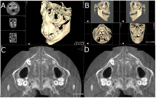 (A) CBCT scan uploaded to the three-dimensional orthodontic-planning software, (B) alignment procedure of the CBCT scan, (C) alignment and (D) measurement procedure of the palatine suture expansion at the central incisors, canines and first permanent molars.