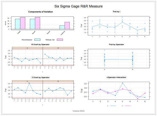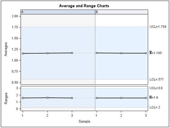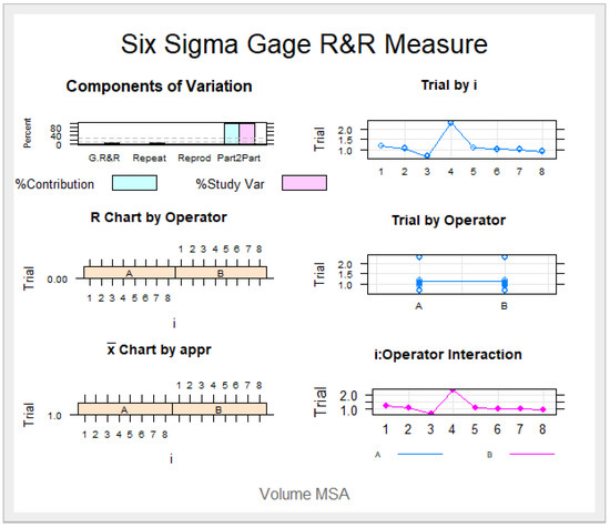The Gage R&R statistical analysis of the digital measurement technique in terms of the volume of the palatine suture expansion through palatine rapid maxillary expansion technique showed a repeatability value of 0.09%. Repeatability values below 1% are necessary to demonstrate high repeatability; therefore, the morphometric measurement technique demonstrated a high repeatability rate for area measurement (Figure 6 and Figure 7). In addition, the Gage R&R statistical analysis of the digital measurement technique in terms of the volume of the palatine suture expansion through palatine rapid maxillary expansion technique performed by the two operators showed a reproducibility value of 0.00%. Reproducibility values below 1% are necessary to demonstrate high reproducibility; therefore, the morphometric measurement technique demonstrated a high reproducibility rate for volume of the palatine suture expansion through palatine rapid maxillary expansion technique (Figure 6 and Figure 7).