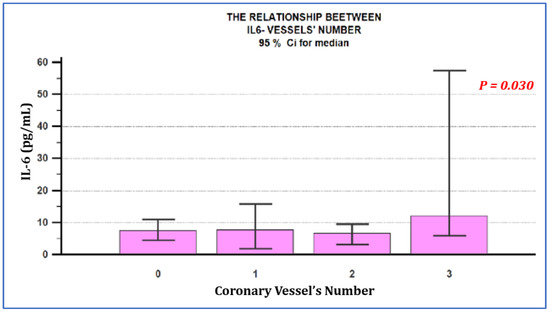 Relationship between the serum IL-6 value and the number of affected coronary vessels. IL-6 levels were similar in the group of patients with microvascular angina, one and two-vessel coronary artery disease, but statistically significantly higher among patients with three-vessel coronary lesions (p = 0.030). 0—microvascular angina; 1—one-vessel coronary disease; 2—two-vessel coronary disease; 3—three-vessel coronary disease.
