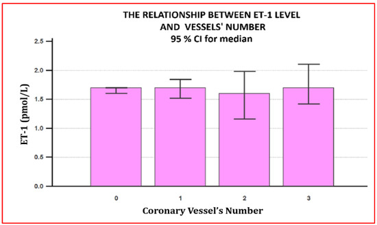 The relationship between plasma ET-1 concentration and the number of coronary lesions. The plasma concentration of ET-1 did not show significant differences either in terms of the type of coronary heart disease, microvascular versus macrovascular, either in terms of the number of coronary arteries involved for patients with obstructive coronary heart disease. 0—microvascular angina; 1—one-vessel coronary disease; 2—two-vessel coronary disease; 3—three-vessel coronary disease.