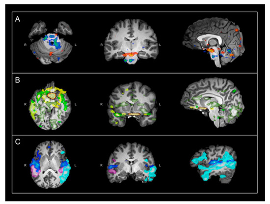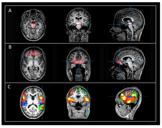 Select rs-fMRI networks in patient (case–control) evaluated for possible seizure focus (not detected, otherwise typical networks). All images are in radiological orientation. The indicated networks are overlaid on T1-weighted images in axial, coronal, and sagittal views. (A) Example of typical subcortical and brainstem networks; (B) Additional examples of typical networks extending over bilateral vmPFC region; (C) Typical language networks. Rows A and B, red color denotes BOLD activation. Row C, each color denotes a separate language network. Abbreviations: rs-fMRI = resting state functional magnetic imaging; vmPFC = ventromedial prefrontal cortex.