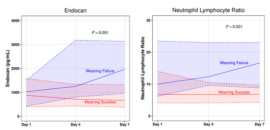 Seven-day changes in clinical variables and laboratory parameters were assessed to account for dynamic changes in biomarker levels in terms of predicting weaning failure. Only endocan (median AUC: 688 pg/mL [IQR: 235–1257 pg/mL] vs. −59 pg/mL [IQR: −318 to 174 pg/mL]; p = 0.001) and neutrophil lymphocyte ratio (NLR) (median AUC: 1.8 [IQR: 0.5–6.2] vs. −0.4 [IQR: −5.1 to 2.1]; p = 0.04) changes were significantly different between the groups (Figure 1). Serial analyses of the other biomarkers are described in Table S1.