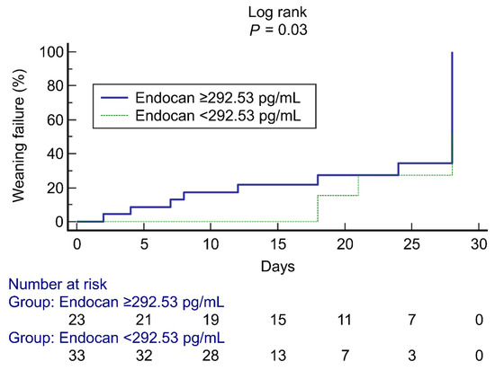 When comparing clinical variables and laboratory parameters between the weaning failure and success groups, nine biomarkers were significantly different within the univariable analyses, including qSOFA score, SpO2/FiO2, PCT, D-dimer, Ang-2, Ang-2/Ang-1, endocan (4-day and 7-day increases), and TNF-α (Table 1 and Table 2). These nine biomarkers were selected to construct a prediction model for weaning failure (Table 3). The 7-day increase in endocan (AUC: 0.81, 95% confidence interval, 0.67–0.94; p < 0.001) was the best predictor when compared with SpO2/FiO2, SOFA score, PCT, and D-dimer (Figure 2). The optimal cut-off for the 7-day increase in endocan (to predict weaning failure) was 292.53 pg/mL based on Youden’s index, with a 78% sensitivity and 79% specificity. Cumulative weaning failure assessed by a Kaplan-Meier curve with a cut-off of 292.53 pg/mL demonstrated a distinct separation between the groups (Figure 3); 61% (14/23) of patients with a 7-day increase in endocan of ≥292.53 pg/mL failed to be liberated from oxygen therapy at day 28, whereas only 12% (4/33) of patients with endocan <292.53 pg/mL failed. Models for predicting weaning failure through other biomarkers are described in Table S2.