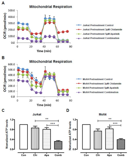 3.2. The Cytotoxic Effects of Apatinib and Chidamide on T-ALL Cells Are Associated with Blockade of Mitochondrial Respiration