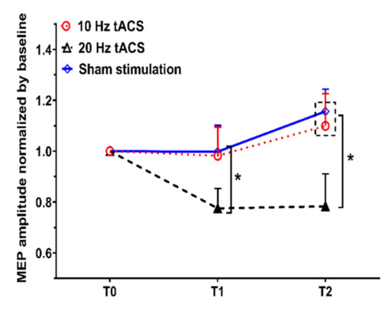 Impact of tACS on motor cortex excitability. Either tACS at 10 Hz and 20 Hz or a sham stimulation was applied over the left M1 during the action observation, followed by the action execution. Motor-evoked potentials (MEPs) were recorded before the action observation (T0), immediately after the action observation (T1), and after the action execution (T2). Each intervention condition included 16 participants. Error bars represent the standard error of means. MEP amplitudes significantly decreased following 20 Hz tACS at time T1 and T2, in contrast with the sham stimulation. MEPs were significantly reduced in the 20 Hz tACS condition at time T2 in comparison with the 10 Hz tACS condition but did not significantly change at time point T1 between the 20 Hz and 10 Hz tACS conditions. There were no significant differences at time point T1 and T2 between the 10 Hz tACS condition and the sham stimulation. * denotes significant differences between groups (* p < 0.05).