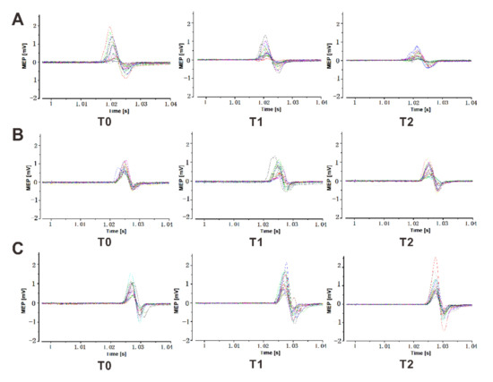 Raw electromyographic data traces from a representative individual showing motor-evoked potentials (MEPs). MEPs evoked by TMS over the left motor cortex in the 20 Hz tACS (A), 10 Hz tACS (B) or sham stimulation (C) conditions. Either tACS at 20 Hz and 10 Hz or a sham stimulation was applied over the left M1 during the action observation, followed by the action execution. MEPs were recorded before the action observation (T0), immediately after the action observation (T1), and after the action execution (T2).