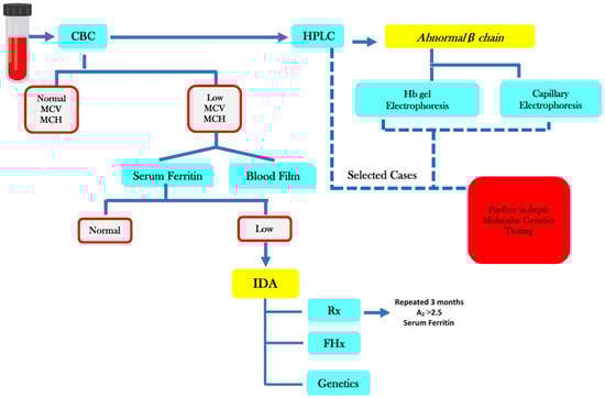 - Belhoul, K.M.; Abdulrahman, M.; Alraei, R.F. Hemoglobinopathy carrier prevalence in the United Arab Emirates: First analysis of the Dubai Health Authority premarital screening program results. Hemoglobin 2013, 37, 359–368. [Google Scholar] [CrossRef] [PubMed]