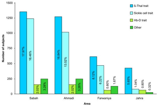The total number of individuals identified with β-thal trait was 5861 (2.12%), while 22 individuals (0.008%) were identified with β-thal disease. β-thalassemia prevalence varied by region; 17.97% and 16.84% of β-thalassemia trait cases were from Sabah and Ahmadi regions, respectively, followed by Farwaniya (8.12%) and Jahra (5.65%) regions. Regarding Sickle cell hemoglobinopathies, 5003 subjects (1.81%) were carrying the Sickle cell trait, while 172 subjects (0.062%) had Sickle cell disease including Sickle cell anemia (SCA). The rates of Sickle cell trait were highest in the Sabah region (16.45%) followed by Ahmadi (13.52%), Farwaniya (6.22%) and Jahra (1.04%) regions (Figure 3).