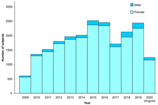 The total number of males and females with iron deficiency anemia cases from August 2009 to August 2020.