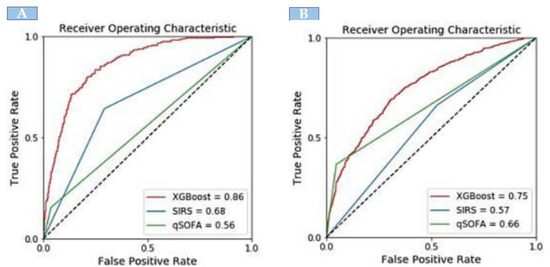 The area under the receiver operating curve comparison of XGBoost model with SIRS and qSOFA; (A) internal validation and (B) external validation.