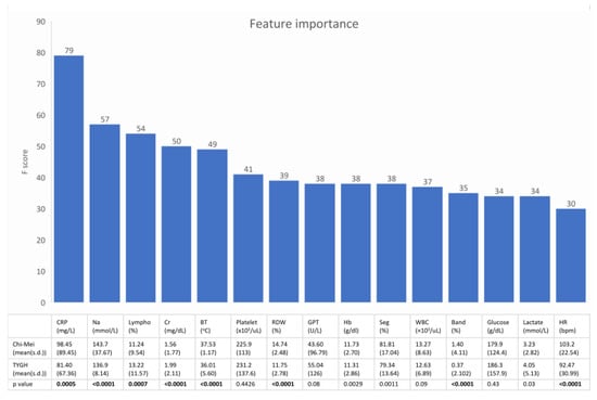 In contrast to the neural network, which is like a “black box”, we adopted the XGBoost model for its better clinical interpretability. According to Figure 2, the top-ranking features of the machine learning model, such as CRP, Na, Cr, BP, and platelets, correspond well with the key clinical features that physicians use to identify sepsis or to assess the severity of sepsis.