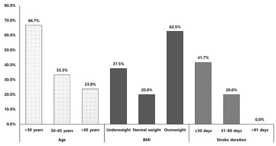 - Burke, D.T.; Al-Adawi, S.; Bell, R.B.; Easley, K.; Chen, S.; Burke, D.P. Effect of Body Mass Index on Stroke Rehabilitation. Arch. Phys. Med. Rehabil. 2014, 95, 1055–1059. [Google Scholar] [CrossRef] [PubMed]