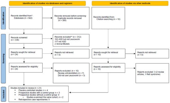 A prospective protocol for this review was developed a priori and the search terms and selection criteria were chosen to capture all pertinent publications. The search included individuals with autistic disorder, Asperger syndrome, pervasive developmental disorder-not otherwise specified (PDD-NOS) and ASD. A computer-aided search of PUBMED, Google Scholar, CINAHL, EmBase, Scopus, and ERIC databases from inception through September 2021 was conducted to identify pertinent publications using the search terms “autism”, “autistic”, “Asperger”, “pervasive”, “ASD”, and “PDD” in all combinations with “folinic acid”, “leucovorin”, “folate”, “folic”, “methyl-folate”, “5MTHF”, “levofolinic”, “folinate”, and “formyltetrahydrofolate.” The references cited in identified publications were also searched to locate additional studies.