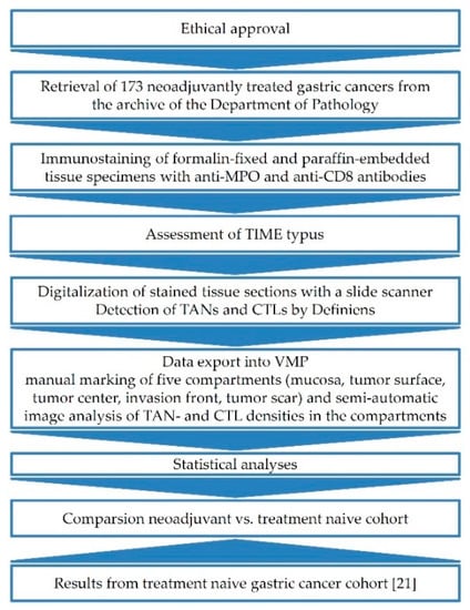 Whole tissue sections from neoadjuvant GCs were stained with an antibody directed against MPO or CD8. The different densities of MPO+ TAN and CD8+ CTL were computed for the tumor compartments, such as the tumor surface, tumor center/tumor scar, invasion front, and peritumoral area. The counts were correlated with clinicopathological patient characteristics and survival. Furthermore, we included data obtained from our former treatment naïve cohort to compare our outcome with the previous results []. Figure 1 provides a schematic overview of the study design.