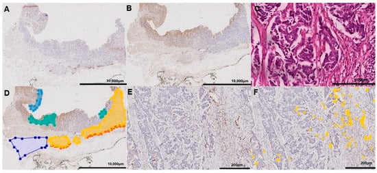 Digital image analysis. Digital image analysis was used to quantify the spatial distribution of tumor-associated neutrophils (TANs; A,D,E,F) and cytotoxic T cells (B) in neoadjuvantly treated gastric cancer. The viewer and painting program VMP was used to mark the tumor compartments (D): mucosa (light blue), tumor surface (green), tumor center (yellow), invasion front (orange), and tumor scar (dark blue). The density was quantified by image analysis using Definiens Tissue Studio® (TANs identified by Definiens are marked as yellow points; (F). The same tumor is pictured in all figures. Anti-myeloperoxidase immunostaining (A,D,E,F); anti-CD8 immunostaining (B); hematoyxlin and eosin-staining (C).