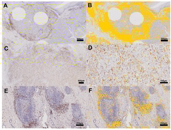 General types of TIME. We used the definition of the different types of TIME by Binnewies et al. [] to divide our cohort. Samples were stained with an anti-CD8+ antibody (A–F). The cytotoxic T cells (CTLs) were marked with a yellow dot using the Definiens Tissue Studio (B,D,F). In the infiltrated-excluded phenotype CTLs are around the tumor (A,B). In the infiltrated-inflamed phenotype CTLs are in the tumor center (C,D). In the TLS-TIME phenotype tertiary lymphoid structures and lymphoid aggregates are found (E,F).