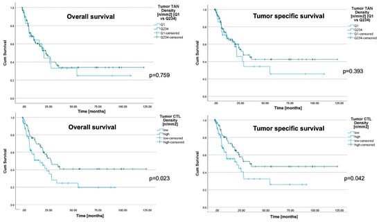 We then compared the dichotomized densities of TAN (Q1 vs. Q2–4) and CTL (Q1/Q2 vs. Q3/4) with patient survival (Figure 4). While no significant difference was found between TAN and OS or TSS (Table S2). The OS and TSS showed a difference of CTLs in the tumor center. Patients with more than 296.2 CTLs/mm2 in the tumor center showed a median OS and TSS of 31.7 and 39.0 months, respectively, compared with 19.3 and 24.6 months in the CTL low group, respectively (Table S3).