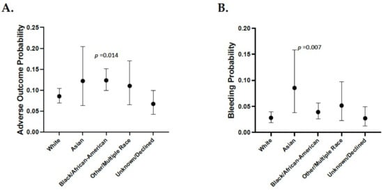 Race-only model for clopidogrel adverse events and bleeding events. Shown is the probability of experiencing any adverse outcome (A) or bleeding events (B) while taking clopidogrel based on race only. All comparisons used the White group as the reference.