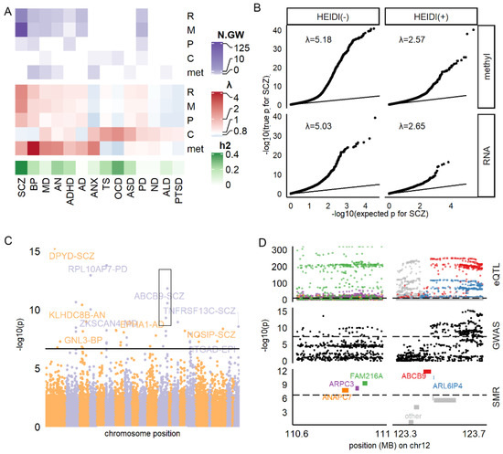 Summary of SMR results. (A) Number of HEIDI(+) molecules reaching genome-wide significance (N.GW; top panel) and inflation factor (middle panel) for each omic and disease. SNP-based heritability (h2) was estimated by Linkage Disequilibrium Score Regression. (B) QQ plot for SMR result of RNA-SCZ and methylation-SCZ association. (C) Manhattan plot for the association between RNA and all diseases. (D) Regional GWAS, QTL, and SMR statistics for SCZ in distal 12q region (black box in (C)) E: selected top molecules associated with multiple diseases. F: association between cytokines, metabolites, and diseases. R: RNA, m/methyl: methylation site. P: protein. C: cytokine. met: metabolite.