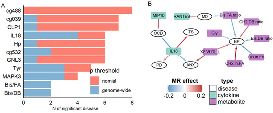 We next analyzed cytokines and metabolites that had an association with brain disorders. As shown in Figure 2 and Table S4, the blood level of IL18 was significantly associated with four disorders: TS (β = 0.19, p = 3.69 × 10−7), OCD (β = −0.19, p = 6.07 × 10−5), ANX (β = −0.15, p = 0.0002) and PD (β = 0.10, p = 0.0005). Similarly, another pleiotropic biomarker, the cytokine MIP1B, was also associated with two disorders (ASD: β = 0.07, p = 1.33 × 10−6; OCD: β = 0.15, p = 3.10 × 10−6). We also observed the pleiotropic association for metabolite markers, shown in Figure 2A and Table S5. In addition, the ratio of bis-allylic in fatty acid (Bis.FA.ratio) was observed to be significantly associated with two disorders: BP (β = −0.14, p = 6.20 × 10−6), MD (β = −0.06, p = 2.87 × 10−5), while multiple metabolites, such as Glycine and ratio of double bonds in fatty acid, were shown to be associated with BP (Figure 2B).