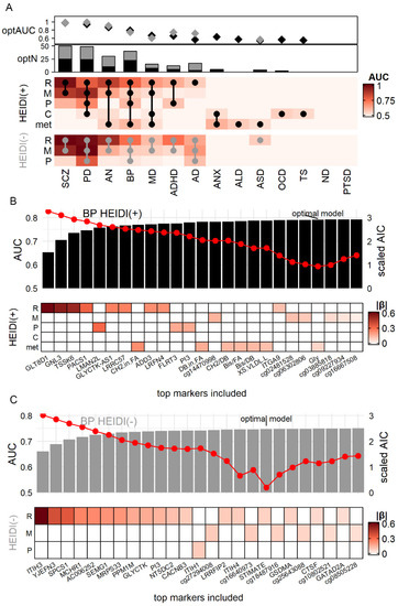 We further explored whether a combination of different omics would gain a better diagnostic power. Figure 2B,C showed the examples of BP biomarker combination, which showed association with four omics. We generated simulation data (Method) of all 26 BP markers and calculated the Akaike information criterion (AIC) to choose the optimal combination of markers. The combination with the lowest AIC had the best trade-off between marker numbers and diagnostic efficiency [38]. We found that the model of the top 22 markers had the lowest AIC (Table S9), which achieved the AUC of 0.79 and R2 of 0.33. This model included RNA markers such as GLT8D1, methylation markers such as cg14470998, protein markers such as LMAN2L, and metabolite markers such as CH2.in.FA (CH2 ratio in fatty acid), suggesting that combining markers from different omics might gain a better power of classifying BP patients from a healthy control. A similar analysis was also carried out for HEIDI(−) BP markers, where an 18-marker model consisted of three omics had the lowest AIC (Figure 3C).