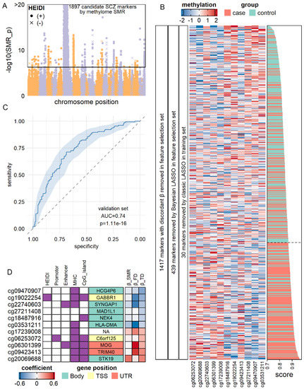 For SCZ methylation markers, we calculated the Spearman correlation coefficient ρ between each of the 1897 SMR-identified markers (both HEIDI(+) and HEIDI(−)) and diagnostic status, and retained only those with (1) ρ and SMR β of same direction; (2) |ρ| > 0.05. Then, we applied a Bayesian LASSO (bLASSO) regression by monomvn R package on the remaining 480 markers. All markers with median posterior coefficients not equal to zero were chosen as candidate marker. In the training set, we applied classical LASSO regression on the candidate markers. All remaining markers, together with their non-zero coefficients, constructed the final diagnostic model. We determined the optimal cut point using cutpointr R package by maximizing Youden’s Index. Finally, the coefficient as well as cut point of the identified model were fixed and applied to the validation set