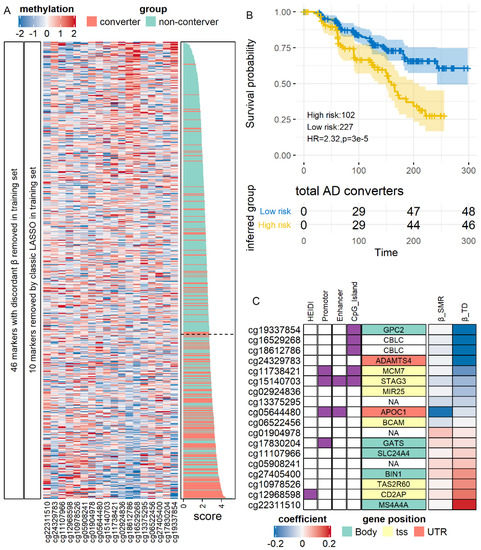 As shown in Figure 5A, we analyzed all 74 SMR-identified AD methylation candidates. In the training set (N = 600), LASSO regression returned an 18-site model which could distinguish converters from non-converters at the accuracy of 0.76 (sensitivity, 0.71; specificity, 0.77). The AUC in the training set was 0.79 (95% CI, 0.75–0.83). Using this model and its optimal cut point estimated in the training set, we classified the validation set into a high conversion risk group (N = 102) and a low-risk group (N = 227). In survival analysis (Figure 5B), we found that the high-risk group had a significantly lower interval of non-conversion survival (Hazard ratio = 2.32, p = 3.1 × 10−5). In the low-risk group, 74% (137) of the MCI patients did not convert to AD in the follow-up period of 300 days, whereas, as in the high-risk group, the median non-conversion survival times were 159 days. Similar to the diagnostic model (Figure S10D), these predictive markers’ proxy genes, including APOC1, GPC2, and SLC24A4 (Figure 5C). In sum, our results indicated that SMR-identified markers of AD could serve as both diagnostic and predictive markers.