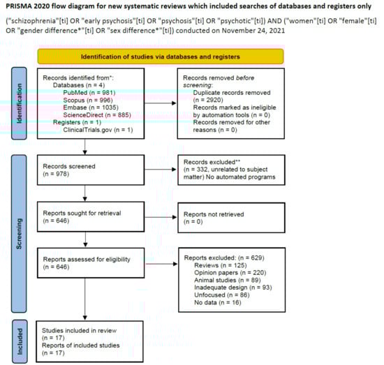 We searched the PubMed/Medline, Scopus, Embase, ScienceDirect databases, since their inception, on 24 November 2021, using the terms (“schizophrenia”(ti) OR “early psychosis”(ti) OR “psychosis”(ti) OR “psychotic”(ti)) AND (“women”(ti) OR “female”(ti) OR “gender difference*”(ti) OR “sex difference*”(ti)), yielding 981 records. We also searched the ClinicalTrials.gov site for further articles. Inclusion criteria included original studies in peer reviewed journals focusing on sex differences in first-episode cohort treatment and outcome. Both longitudinal and cross-sectional studies were eligible and could be retrospective or prospective. There were no time or language limits in regard to the selection of appropriate studies. Reviews or meta-analyses focusing on early psychosis in female patients were not included, but their reference lists were consulted to identify further eligible studies. However, reviews were included if they had effectively summarized preceding evidence comprehensively. Studies were excluded if they did not focus on or were unrelated to the subject matter, if they were case reports or series, or opinions (e.g., letters to the editor or editorials) with no original data. All these were grouped under the heading Opinions, and reviews and metanalyses were grouped under the heading Reviews. Excluded were also animal studies, studies focusing on in vitro differences, those with inadequate study designs and those not reporting data, such as protocols and studies in the ClinicalTrials.gov database which were recruiting and had not concluded data gathering. A particular attention was paid to publications of the last five years (from 2017 to 2021) due to the generally increased quality of the studies published during this time period.