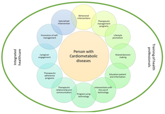 In intervention models focused on patients with cardiometabolic risk, an approach that encompasses behavioral interventions, therapeutic management programs, lifestyle promotion, shared decision making, education patient and information, interventions with the use of technology, promotion of self-management, program using technology, therapeutic relationship, therapeutic adherence programs and specialized intervention.