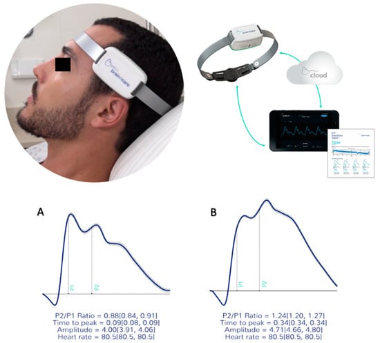 The B4C device in use; real time monitoring is displayed in a common portable device. All data collected is immediately processed on the cloud resulting in the qualitative and quantitative report of intracranial pressure waveforms obtained noninvasively. Waveforms obtained depicting P2/P1 ratio and time-to-peak under normal standards (A) and altered (B).