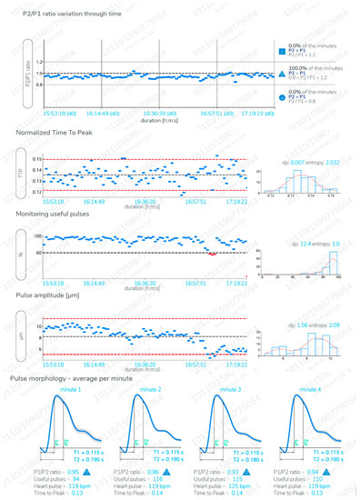 A B4C monitoring report sample of more than an hour length. Real time report is obtained without monitoring interruption as needed. P2/P1 ratio, time to peak, pulse amplitudes and useful pulses (pulses that were successfully recognized) are disclosed for the entire monitoring (each blue point is the mean value for a minute) and a mean waveform with confidence interval (gray zone along the slope) of each monitored minute is also displayed (bottom).