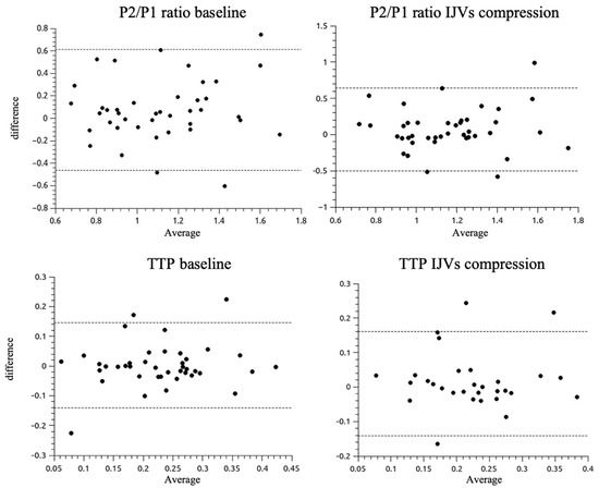 The data were pooled from one 10-min session for each of the 41 patients, resulting in a total sample size of 29.458 cardiac pulses. The Bland–Altman plots for the P2/P1 ratio and TTP for both baseline and with respect to IJV (Figure 4). Thresholds were defined as 1 for P2/P1 ratio and 0.2 for TTP within a 95% limit of agreement.