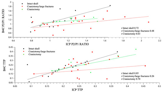 Pearson’s correlation analysis for P2/P1 ratio (up) and TTP (down) separated between groups according to cranial status.