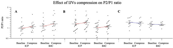 Dispersion plot for both techniques (ICP and B4C). P2/P1 ratio variation according to groups distribution: no cranial damage (A, n = 12), craniotomy/large cranial fractures (B, n = 20) and craniectomy (C, n = 9), regarding ICP elevation intervention. ICP: intracranial pressure, IJVs: internal jugular veins.