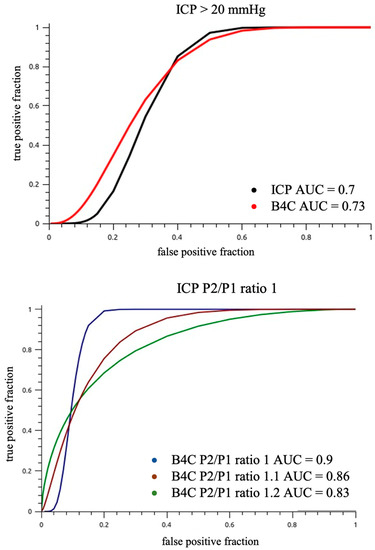 Entire sample ROC analysis of ICP and B4C P2/P1 ratios for an ICP value cut-off >20 mmHg (up). The power of predicting intracranial hypertension was reduced because of sample heterogeneity. The B4C P2/P1 ratio cut-off 1 (down) was equivalent to ICP P2/P1 ratio cut-off 1 (AUC 0.9).