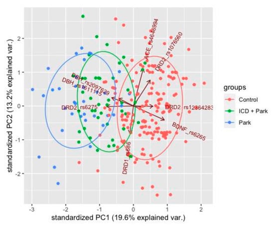 Principal component analysis (PCA) was conducted using R-Studio software based on genotype data in 49 patients of the PD + ICD group, 36 PD patients without ICD and 201 patients from the population control group. The following substitutions demonstrating statistically significant correlation with the disease development were selected for the analysis: DBH (rs2097629, rs1611115), DRD2 (rs6275, rs12364283, rs1076560), ACE (rs4646994), DRD1 (rs686), BDNF (rs6265).
