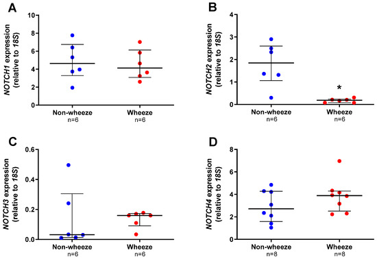 Notch receptors gene expression profiles in ex vivo pAEC from children with and without wheeze. Relative expression of NOTCH1–4 receptors (A–D) were measured in ex vivo pAEC from children with and without wheeze (n ≥ 6) by real-time qPCR (refer to 2.5.4). (A) NOTCH1 was the most abundantly expressed Notch receptor gene in ex vivo pAEC from a paediatric cohort. However, NOTCH1 mRNA expression was not significantly different between pAEC from children without wheeze. (B) In contrast, mRNA expression of NOTCH2 was significantly lower in pAEC from children with wheeze compared to their non-wheeze counterparts. (C,D) Finally, no significant differences were observed between pAEC from children with and without wheeze in mRNA expression of NOTCH3 and NOTCH4, although the genes were expressed at different magnitudes. Each dot represents the mean of two replicates from a single ex vivo sample. Data are normalized to housekeeping gene, 18S and represented as median ± IQR. * Statistical significance relative to the non-wheeze cohort (p < 0.050; Mann–Whitney U-test).