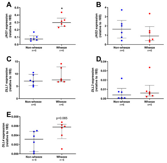 Notch ligands gene expression profiles in ex vivo pAEC from children with and without wheeze. Relative expression of Notch ligands; JAG1–2 (A,B) and DLL1-4 (C,E) were measured in ex vivo pAEC from children with and without wheeze (n = 6) by real-time qPCR. (A) mRNA expression of JAG1 was significantly increased in pAEC from children with wheeze compared to their non-wheeze counterparts. (B) JAG2 mRNA expression was not significantly different between pAEC from children with and without wheeze. (C,E) DLL1 was the most abundantly expressed Notch ligand in ex vivo pAEC from a paediatric cohort. However, no significant differences were observed between pAEC from children with and without wheeze in mRNA expression of DLL1 (C), DLL3 (D) and DLL4 (E), although the genes were expressed at different magnitudes. Each dot represents the mean of two replicates from a single ex vivo sample. Data are normalized to housekeeping gene, 18S and represented as median ± IQR. * Statistical significance relative to the non-wheeze cohort (p < 0.050; Mann–Whitney U-test).