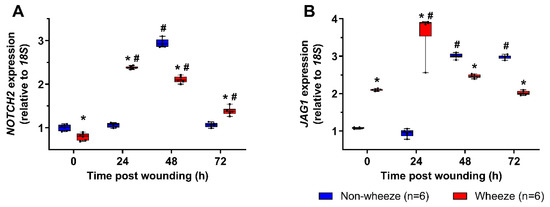 NOTCH2 and JAG1 gene expression profiles in pAEC post in vitro wounding. Relative expression of NOTCH2 (A) and JAG1 (B) mRNA were measured in pAEC post in vitro wounding from children with (n = 6) and without wheeze (n = 6) by real-time qPCR. (A,B) Following wounding, pAEC from children without wheeze displayed a significant upregulation of NOTCH2 and JAG1 mRNA expression at 48 h post wounding respectively. By 72 h post wounding, NOTCH2 mRNA expression (A) had returned to baseline levels, whilst JAG1 mRNA expression (B) was maintained at about 3-fold higher levels than baseline. In contrast, pAEC cultures from children with wheeze displayed lower gene expression levels of NOTCH2 (A) and higher gene expression levels of JAG1 (B) at baseline. An earlier induction of NOTCH2 mRNA expression was observed in pAEC from children with wheeze at 24 h post wounding, which was sustained to 72 h post wounding. Although JAG1 mRNA levels were induced by 24 h post wounding, JAG1 expression returned to baseline levels by 72 h post wounding indicating distinct differences in the kinetics of Notch signaling during airway epithelial repair in children with wheeze. Data are represented as median ± IQR. * Statistical significance of the wheeze group relative to matching non-wheeze timepoint sample (p < 0.050; Mann–Whitney U-test), or # statistical significance of relevant timepoint to time 0 h of matching patient cohort (p < 0.050; Kruskal–Wallis test with Dunn’s test for multiple comparisons).