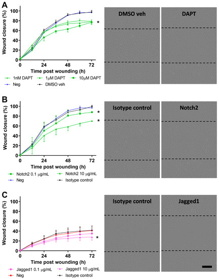 To assess the role of Notch signaling during repair, GSI-mediated global Notch inhibition experiments via DAPT or specific Notch2 and Jagged1 antibody blocking experiments were conducted. Once confluent, cell cultures were starved in BEGM (minus EGF) containing either a concentration range of DAPT (1 nM to 10 μM), Notch2 or Jagged1 blocking antibodies (0.1 and 1 μg/mL) for 24 h prior to in vitro scratch wounding. Culture media were replenished every 48 h due to limited DAPT stability at 37 °C. DAPT experiments were compared to the vehicle control containing equivalent levels of DMSO to the maximal DAPT concentration, that is 0.1% (v/v) DMSO diluted in BEGM (minus EGF). Blocking antibody-treated cultures were compared to isotype control antibody (IgG1κ, MOPC-21) prepared at the maximum concentration (1 μg/mL).
