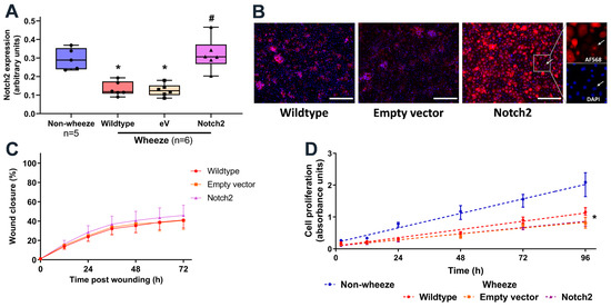 Overexpression of Notch2 in pAEC from children with wheeze. (A–D) Cultures from children with wheeze were infected with a retrovirus containing either the empty vector-GFP or Notch2-GFP. (A) Protein expression of Notch2 was measured by In-Cell Western and normalized to cell number. (B) Immunofluorescent staining for Notch2 intracellular domain protein identified its nuclear staining in Notch2-overexpressed cultures. Scale bar: 200 µm (20× magnification) (C) Monolayer pAEC cultures expressing Notch2-GFP (purple triangles) or empty vector-GFP (orange squares) and wildtype controls (red circles) displayed comparable repair capacity following in vitro scratch wounding. (D) Cultures from children with wheeze (red circles) showed significantly lower cell proliferation rates compared to non-wheeze controls (blue circles). Notch2 overexpression (purple triangles) had no effect on cell proliferation compared to empty vector-GFP (orange squares) or wildtype wheeze controls (red circles). Experiments utilized pAEC cultures from children with (n = 6) and without wheeze (n = 5). Data are represented as median ± IQR (* p < 0.050, wheeze vs. non-wheeze; # p < 0.050, empty vector/Notch2 vs. Wildtype control; Dunn’s multiple comparisons test).
