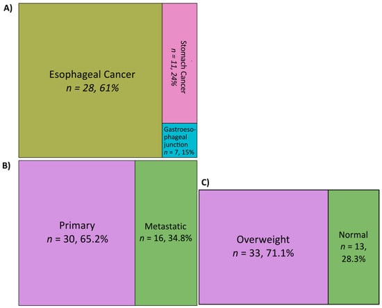 Of the 46 GEAC patients comprising the study cohort, 61% of these patients had esophageal cancer, 24% had stomach cancer, and 15% had cancer of the gastroesophageal junction (Figure 1). Tissue was obtained from primary tumors in 65.2% of the patients, while the remainder were metastatic (Figure 1). The median age at diagnosis was 64 years, and the cohort was 89.1% male and 10.9% female (Table 1). Half of the patients had received immune-modulating drugs (nivolumab, pembrolizumab, ramucirumab, or trastuzumab), while the remainder had not (Table 1). Further, 71.1% of the patients were overweight (BMI ≥ 25), while the remainder were in the normal BMI range (BMI < 25) (Figure 1).