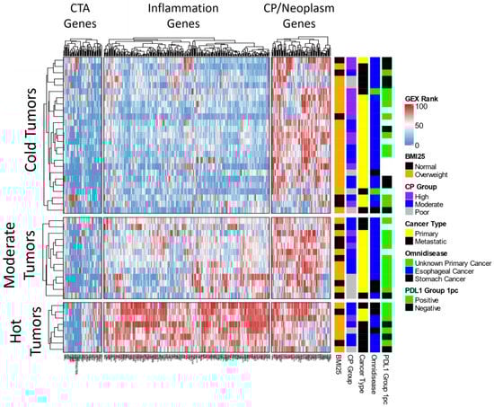 Unsupervised analysis of the gene expression data revealed three distinct patient clusters, namely, hot, moderate, and cold (Figure 2). As expected, hot tumors were over-represented by >250 immune-related genes (inflammation gene cluster), and 6/8 (75%) of the patients in this cluster were overweight. On the other hand, cold tumors were over-represented by high cell proliferation and overexpression of cancer testis antigen genes, and 20/25 (80%) of the cases in this cluster were overweight. Across the entire cohort of 46 GEAC patients, the majority of cases were cold tumors (52.2%) and the minority of cases were hot tumors (17.4%; Table 1). Additionally, a plurality of cases were moderately proliferative (45.7%), while the minority were poorly proliferative (23.9%; Table 1).