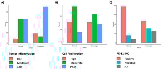 When examining the proportions of each BMI group represented by each tumor inflammation group, we found that normal-weight cases have a significantly higher proportion of moderately inflamed tumors, compared to overweight cases (p = 0.03338; Figure 3a). By analyzing the proportions of each BMI group represented by each cell proliferation group in a similar way, we determined that cell proliferation was not significantly different between the two BMI groups (Figure 3b). Finally, by analyzing the proportions of each BMI group represented by each PD-L1 IHC group, we found that PD-L1 showed a trend towards higher expression in normal-BMI patients than in high-BMI patents, although this difference did not reach statistical significance (p = 0.109; Figure 3c).