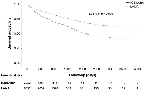 A total of 9284 patients were defined as the crude population; 6352 (68.4%) and 2932 (31.6%) patients were classified in the LAMA and ICS/LABA treatment groups, respectively (Supplementary Materials, Table S1). Table 1 shows the PS-matched population in a 1:1 ratio. In the PS-matched population, 2444 patients were included in the LAMA and the ICS/LABA groups. The total observation time was longer in the LAMA group than in the ICS/LABA group (787.0 ± 639.5 vs. 716.5 ± 628.4 days, p < 0.001) and other baseline characteristics between the two groups were evenly matched (Table 1).