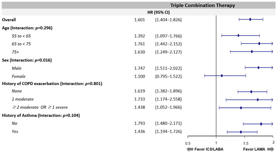 Patients in the ICS/LABA group initiated triple therapy 74 days earlier than those in the LAMA group (281 days vs. 207 days, respectively, in the PS-matched population, p = 0.03). The finding that the ICS/LABA group initiated triple therapy faster than the LAMA group remains the same in the subgroup analysis by age, sex, history of COPD exacerbation, and asthma history. For all age groups, both sexes, and regardless of history of COPD exacerbation or asthma, patients treated with ICS/LABA showed an earlier initiation of triple therapy than those treated with LAMA (Table 2, Figure 2).